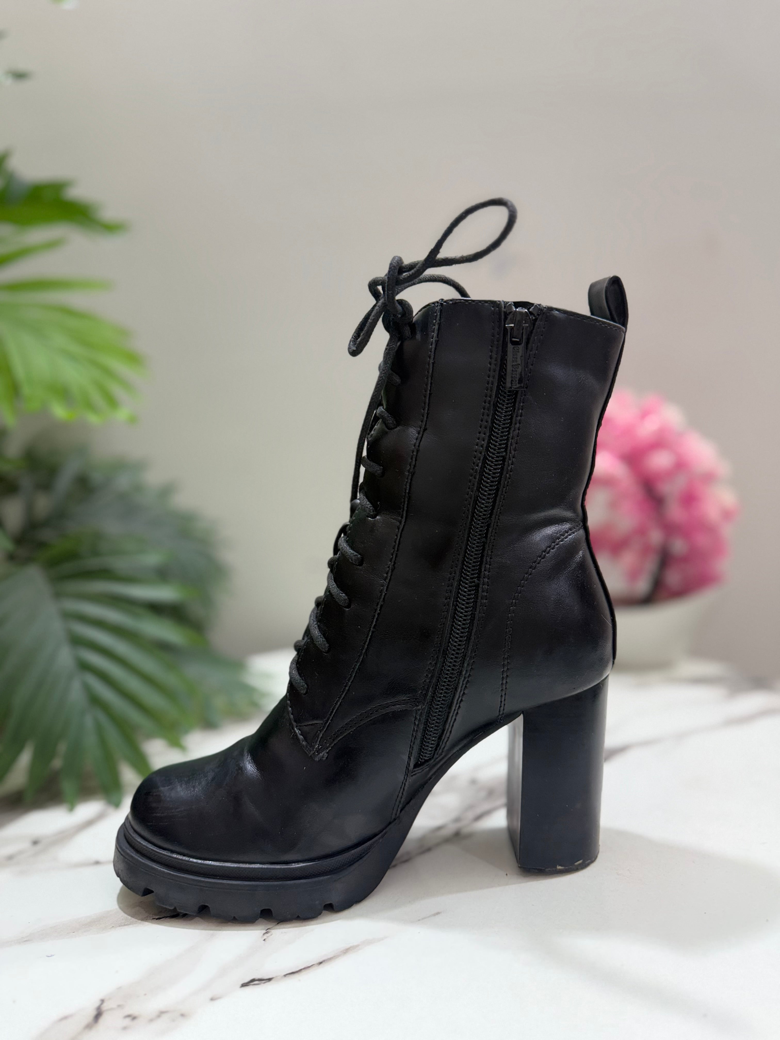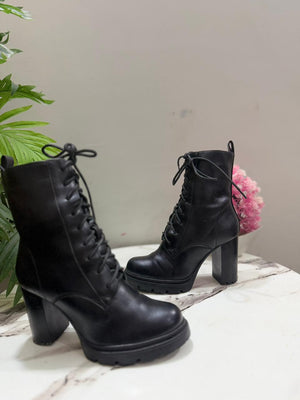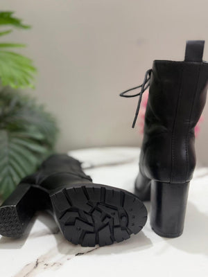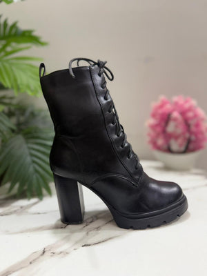 Black heeled laceup ankle boot with side zipper ( clara barson)