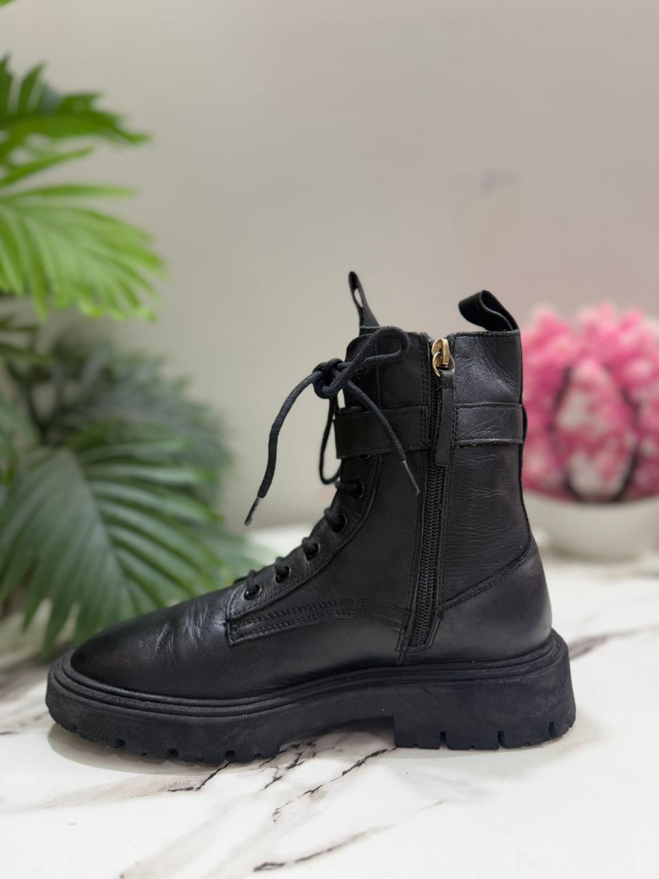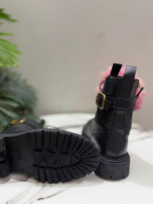 Black leather laceup boot with side zipper and golden buckle (Zara)