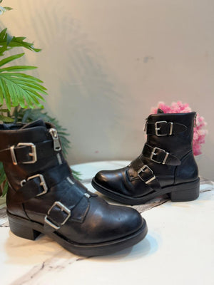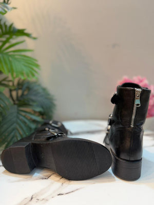 Black leather triple buckle zipper ankle boot european brand
