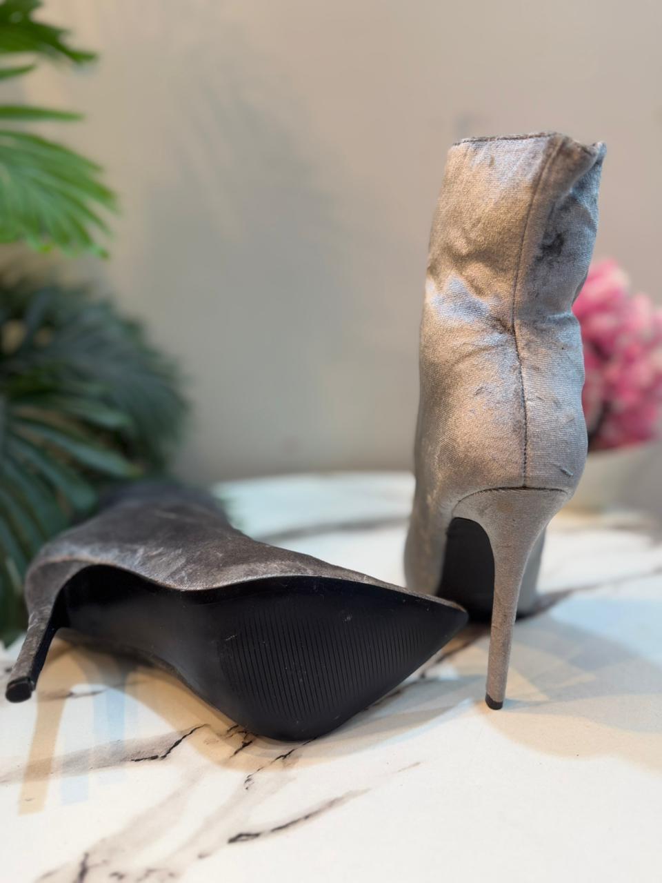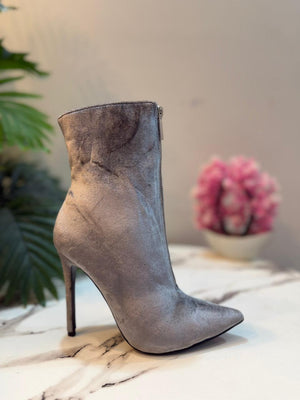 Grey velvet front zipper heeled ankle boot (just fab)